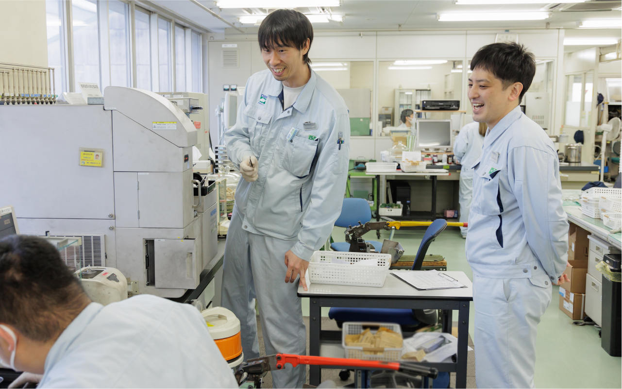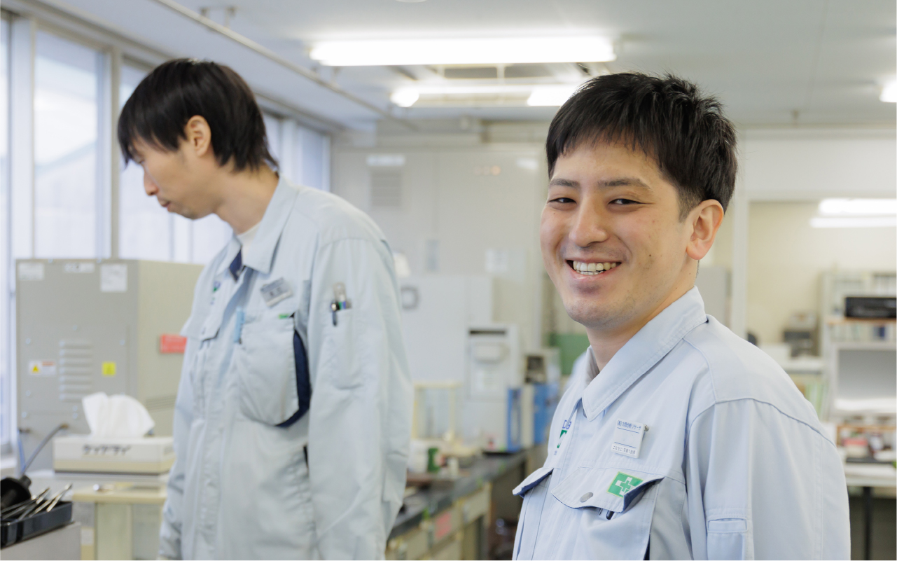 私は分析装置の管理や分析方法の検討を担当してきましたが、スタッフ入社した者は、早い段階から1人1テーマを持たせてもらっています。これはやりがいにつながりますし、またテーマに沿って、自分が主体となって仕事を進めることもできます。頑張るところは頑張り、休みを取りたいときは周りと調整して休みを取ることも可能なので、働きやすいと思います。また、何より人間関係が良好です。仕事でわからないことは先輩や上司に聞きやすいですし、ちょっとした困りごとも相談しやすいですね。残業も少なく、休暇はしっかり取れるのでプライベートも充実しています。