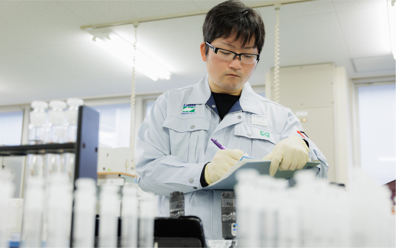 私たちのお客様は、大同特殊鋼をはじめ工場が多く、そこから排出される排出水や排ガスなどは、安全とされる基準値を守らなければなりません。そのため、基準値がクリアできているか、有害物質が含まれていないかを調べる必要があり、私はその分析調査を担当しています。分析に必要な試料については、当社の採取担当に採取してきてもらうことが多いのですが、自分自身が行くケースもあります。排出水や排ガスなどの試料の採取は、作業が難しい場所もあり、どう採取するかを考えることからスタートするときもありますね。そうして集めた試料を分析し、結果をお客様に報告しています。